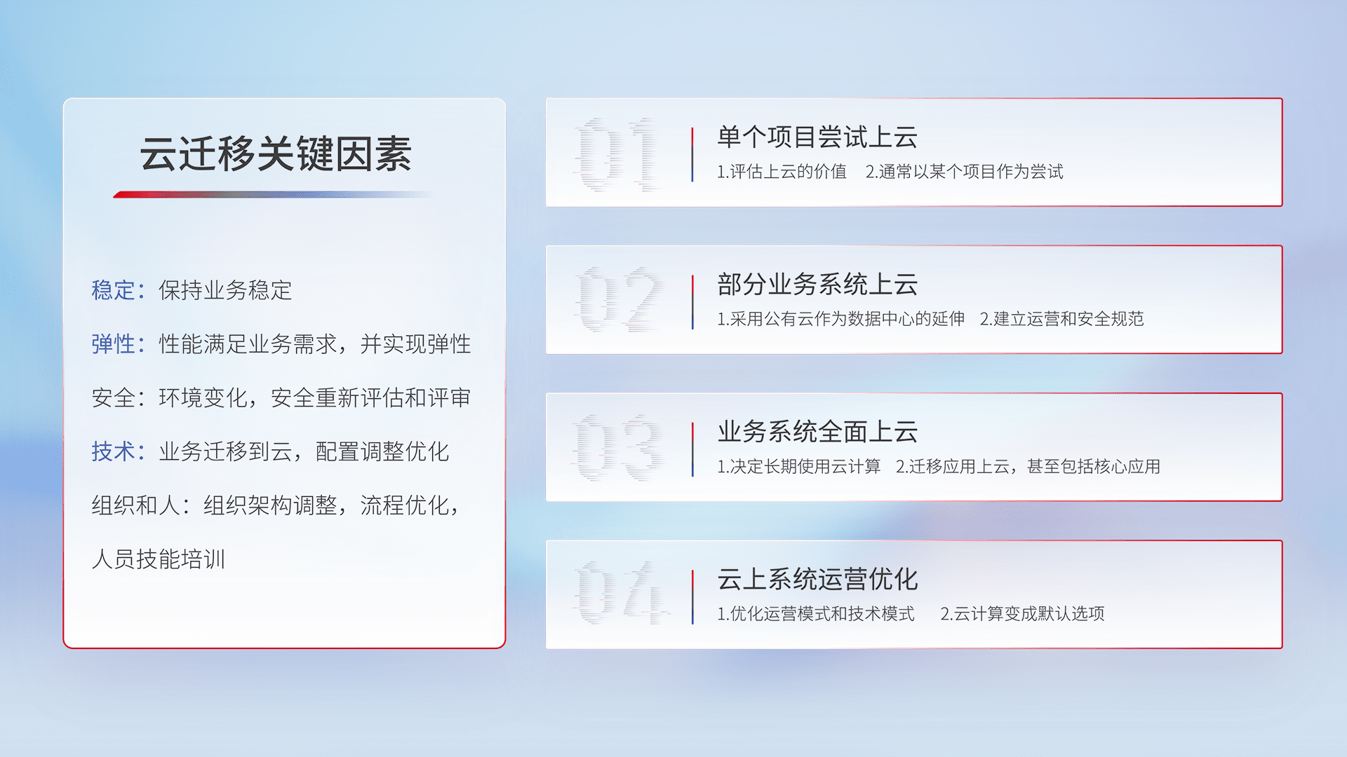 结合实际业务,,从规划设计、、云平台选型、、、、云原生改造、、数据迁移、、、、集成交付,,迁移全过程为客户识别最佳上云路径,,,做好风险识别管理,,设计网络架构、、、、身份权限、、安全审计合规、、、操作审计、、日志审计、、监控告警策略、、、多站点容灾设计等,,对云上基础设施进行整体规划,,,,提升IT治理水平,,,,以满足弹性、、、高可用、、、高性能的需求。。。。