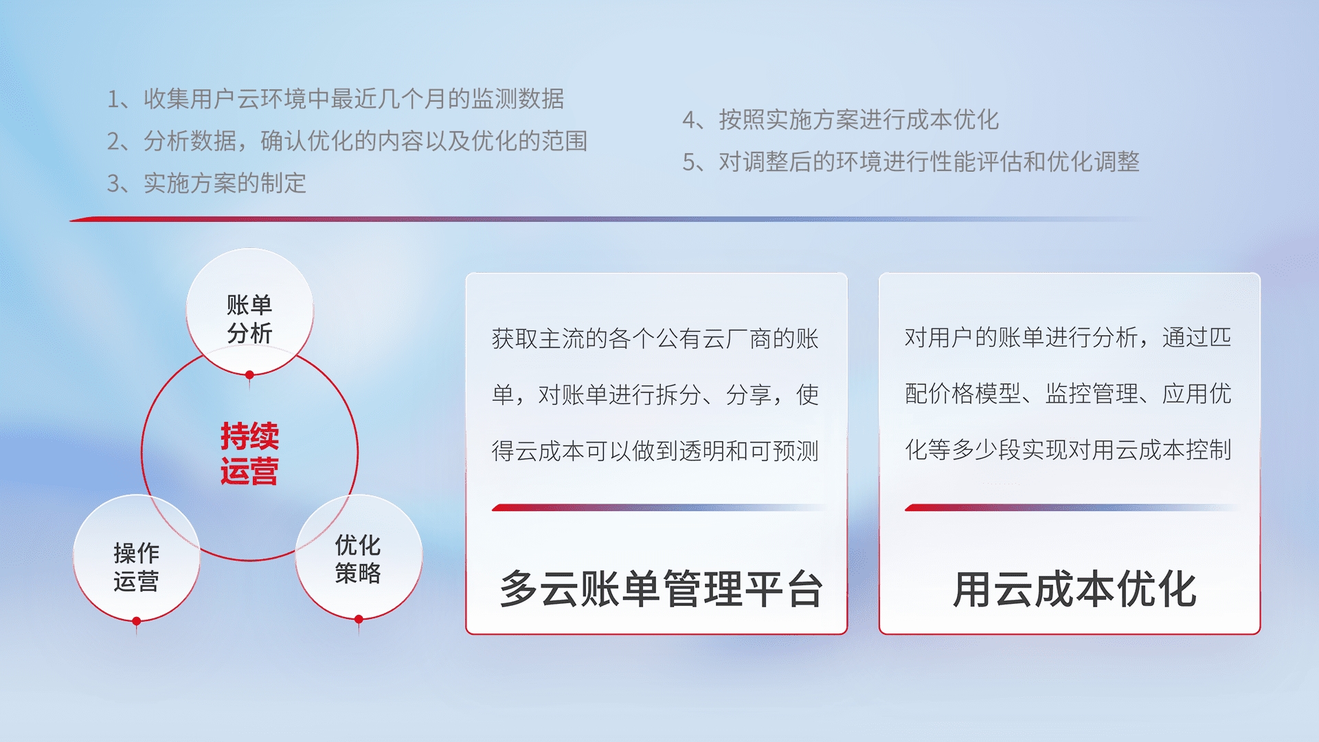 通过多云纳管,,,以统一的资源数据模型把客户的云资源进行抽象和封装,,,进而实现对多云资源的统一操作,,,保障云资源管理的可靠性、、稳定性与可用性。。。。量身定制化运维内容,,配置、、、、开发运维、、、、补丁管理、、、、备份、、、、监控、、认证和访问管理、、、审计和日常巡检等,,,保障在用云过程中的可靠度,,稳定度以及高可用率。。